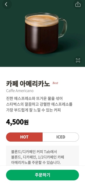 실제 주문을 해도 괜찮고, 지금처럼 사용 여부만 확인하면 된다. 우리는 아무 메뉴나 선택해서 주문할 것이다. 제가 실제로 주문한 이후로 아메리카노 톨 사이즈는 항상 고정해서 마셔요.