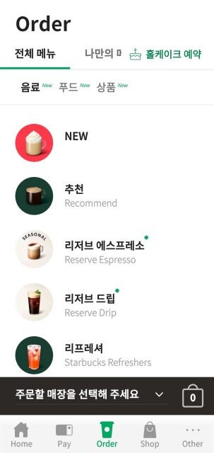 다행히 모두 스타벅스 쿠폰이라 스타벅스 앱을 먼저 켜고 확인한다. 이미지 쿠폰을 확인하려면 주문 절차를 진행해야 합니다. 그래서, 하단 중앙에 있는 "주문" 메뉴로 가세요.