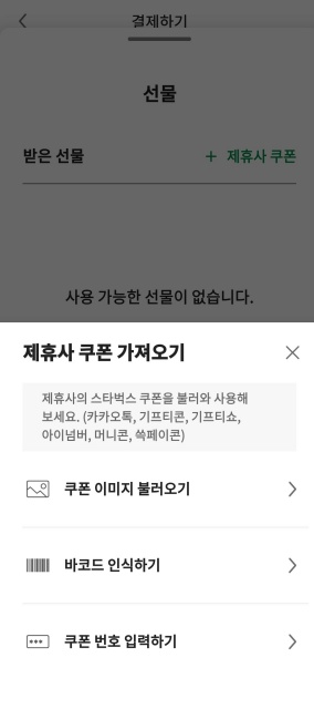 다운받은 쿠폰이미지를 불러오거나 쿠폰 번호를 입력해서 기프티콘을 클릭하면 간단하게 기프티콘을 이용한 스타벅스 어플에서 주문이 가능하답니다.